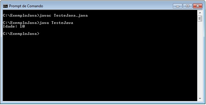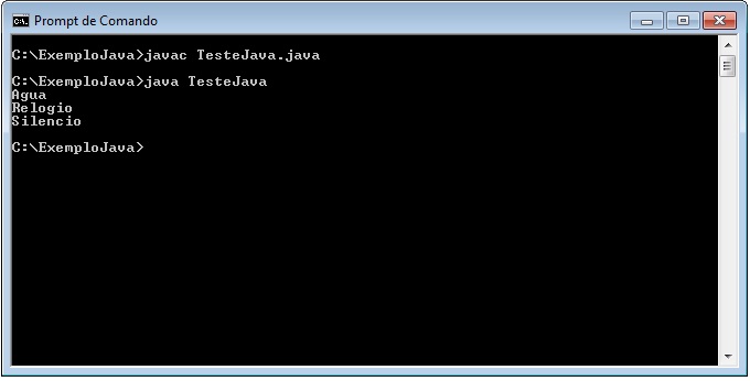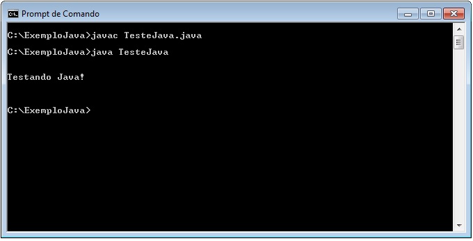C:\ExemploJava>javac TesteJava.java C:\ExemploJava>java TesteJava C:\ExemploJava> |