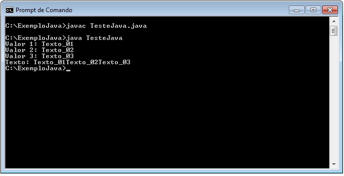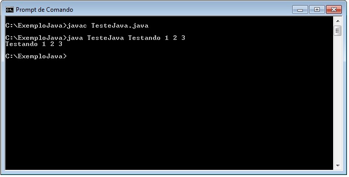 C:\ExemploJava>javac TesteJava.java C:\ExemploJava>java TesteJava Testando 1 2 3 C:\ExemploJava> |