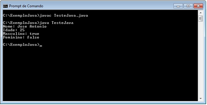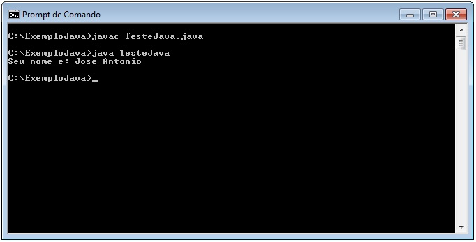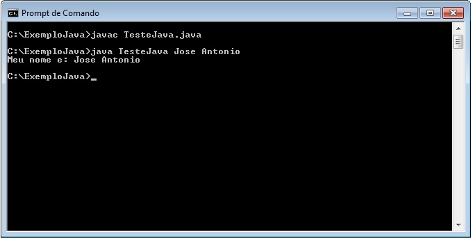 C:\ExemploJava>javac TesteJava.java C:\ExemploJava>java TesteJava Jose Antonio C:\ExemploJava> |