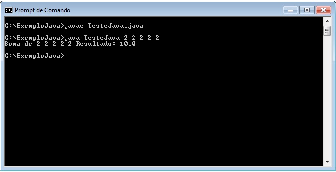 C:\ExemploJava>javac TesteJava.java C:\ExemploJava>java TesteJava 2 2 2 2 2 C:\ExemploJava> |