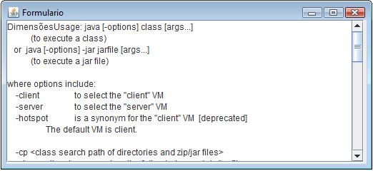 import java.io.*; import javax.swing.*; public class JavaTeste extends JFrame { private JTextArea area_texto; public JavaTeste() { super("Formulario"); Container ct = this.getContentPane(); area_texto = new JTextArea("Dimensões"); area_texto.setLineWrap(true); JScrollPane barra_de_rolagem = new JScrollPane(area_texto); barra_de_rolagem.setBounds(0,0,500,200); ct.add(barra_de_rolagem); Image Icone = Toolkit.getDefaultToolkit().getImage("icon.gif"); this.addWindowListener(new WindowAdapter() { } |