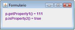 import javax.swing.*; public class JavaH extends JFrame { public JavaH() { super("Formulario"); Container ct = this.getContentPane(); MyBean p = new MyBean(); JLabel label_ = new JLabel(); label_.setText("<html>p.getProperty1() = "+p.getProperty1()+"<br>p.isProperty2() = "+p.isProperty2()+"</html>"); label_.setVerticalAlignment(JLabel.TOP); Image Icone = Toolkit.getDefaultToolkit().getImage("icon.gif"); this.setVisible(true); this.addWindowListener(new WindowAdapter() { } |