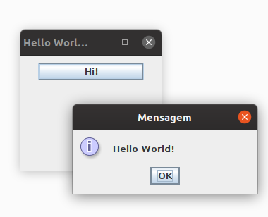 | import javax.swing.*; import java.awt.*; import java.awt.event.*; public class Window { public JFrame janela; public JButton botao; public void Window() { janela = new JFrame(); janela.setTitle("Hello World Example"); janela.setSize(200, 200); janela.setLocation(500, 260); Image Icone = Toolkit.getDefaultToolkit().getImage("icone.png"); janela.setIconImage(Icone); // janela.setDefaultCloseOperation(JFrame.EXIT_ON_CLOSE); janela.setLayout(null); botao = new JButton(); botao.setText("Hi!"); botao.setBounds(25, 10, 150, 25); // objeto.setBounds(esquerda, topo, largura, altura) janela.add(botao); botao.addActionListener(new ActionListener() { public void actionPerformed(ActionEvent e) { JOptionPane.showMessageDialog(null, "Hello World!"); }}); janela.addWindowListener(new WindowAdapter() { public void windowClosing(WindowEvent e) { System.exit(0); }}); janela.setVisible(true); } public static void main(String[] args) { Window jx = new Window(); jx.Window(); } } |