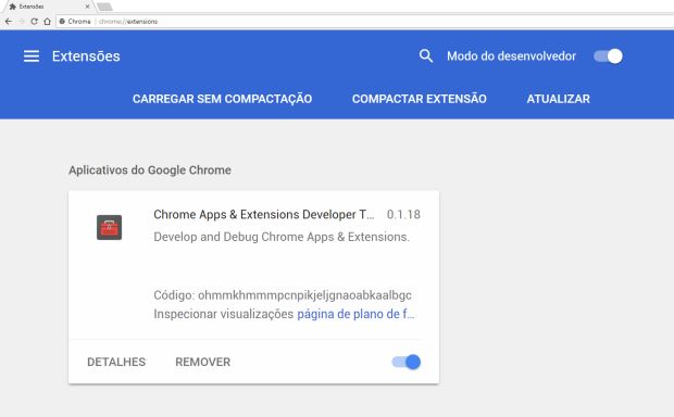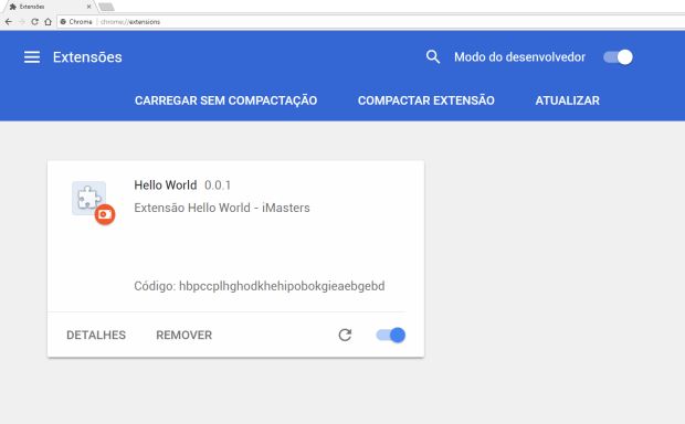 Primeiramente, habilite o Modo do desenvolvedor. Ao fazer isso, as opções “Carregar sem Compactação”, “Compactar Extensão” e “Atualizar” ficarão disponíveis. Clique na primeira opção e selecione o caminho do diretório onde estão os arquivos do seu projeto. Se tudo der certo, a sua extensão irá aparecer na tela: