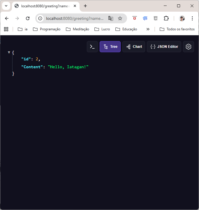 Aí está o JSON "Hello, Iatagan!" do REST API criado
