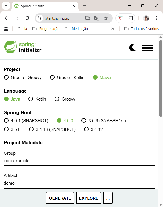 Vá no Site Spring Initializr e faça as seguintes configurações: