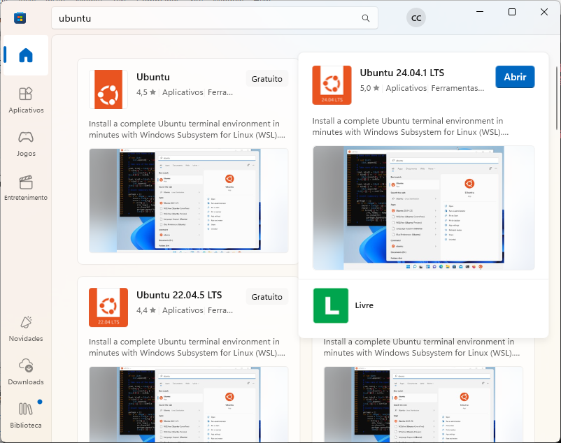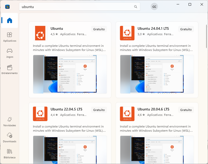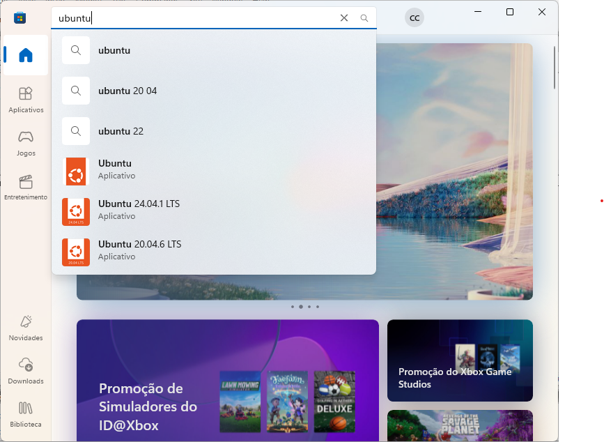 - Na barra de instalação digite ubuntu